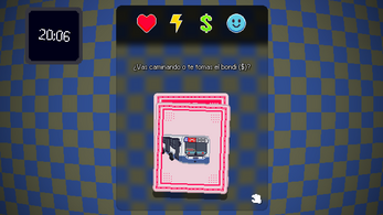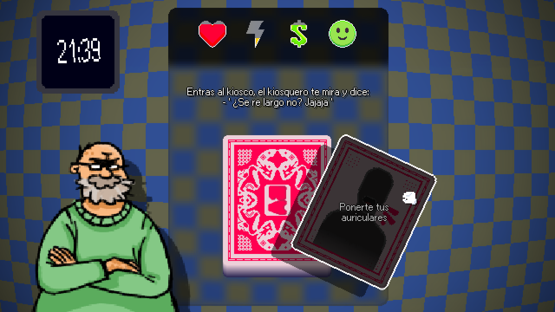 Tomás decisiones moviendo una sola carta hacia la izquierda o la derecha. Cada elección afecta tus estados: salud, energía, plata y estres.